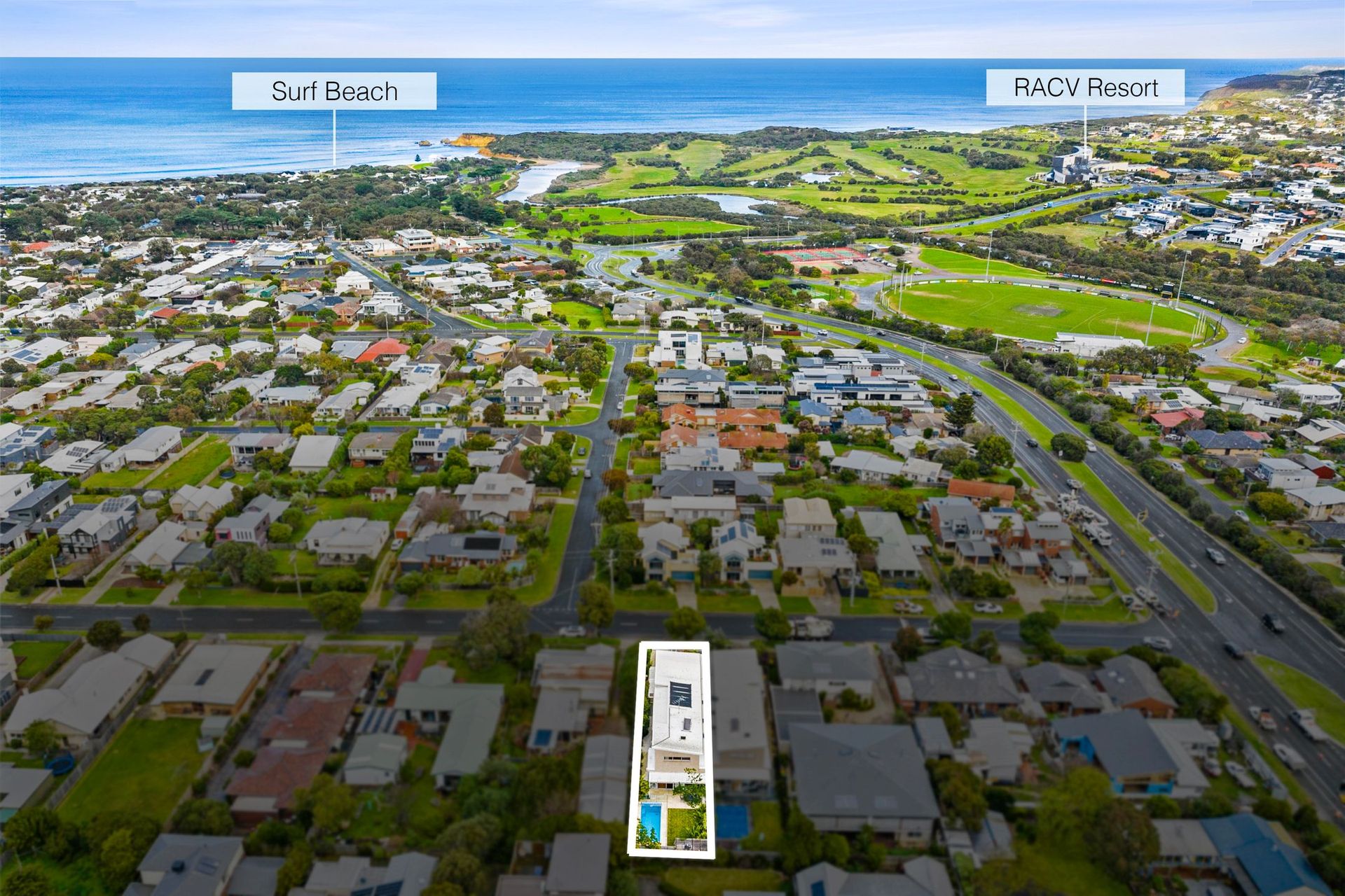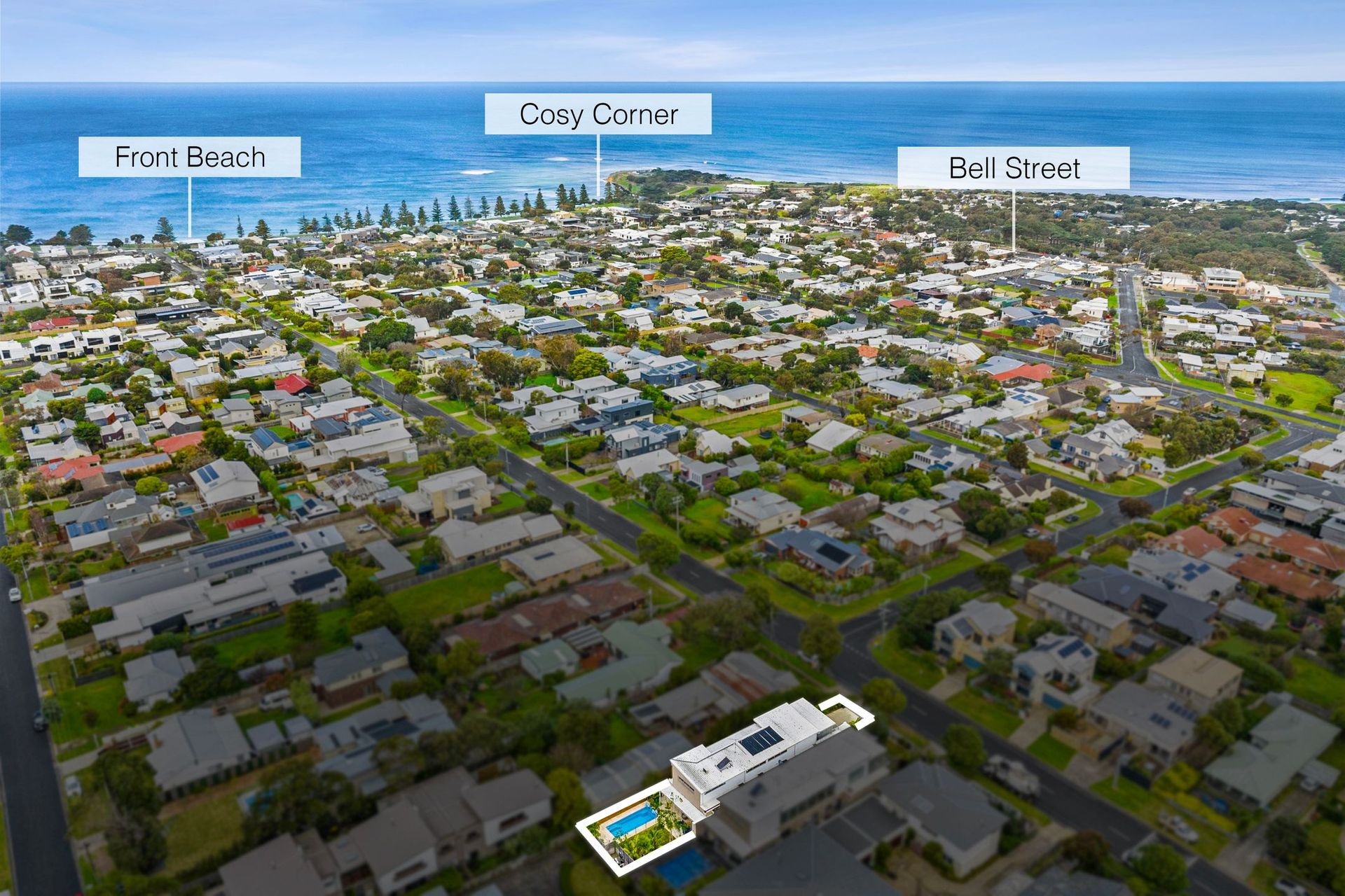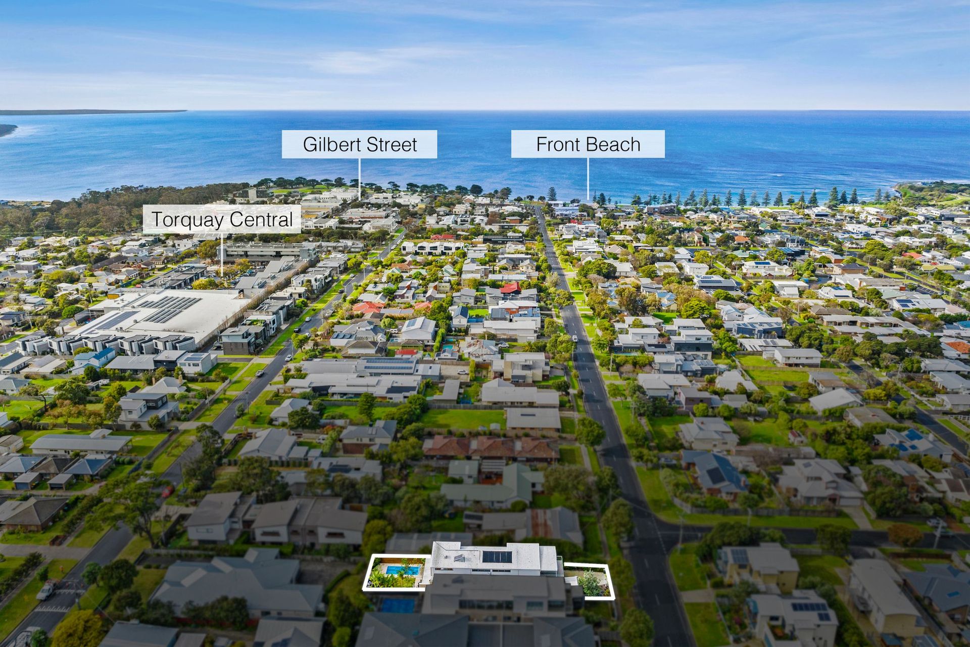 The main commercial center of Torquay spans Pearl Street and Gilbert Street, merging seamlessly with the coastal boulevard of The Esplanade. Additional shops, cafes, restaurants, and the town's historic hotel can be found on Bell Street, opposite a large camping and caravan ground near Point Danger.