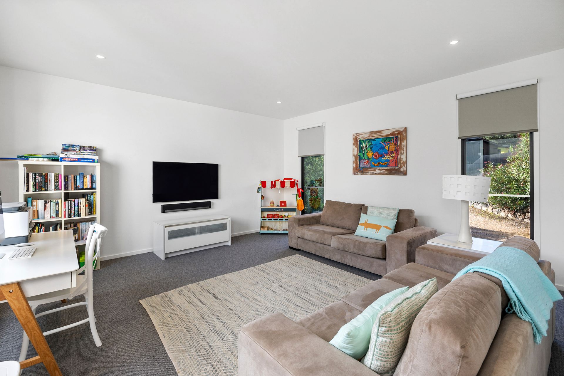 The main living area flows seamlessly into a well-equipped kitchen and dining zone, perfect for entertaining or unwinding after a day at the beach. The master bedroom is privately located on the lower level with a spacious ensuite, while upstairs hosts three additional bedrooms and a family bathroom with a bath. All bedrooms are fitted with split system heating and cooling, ensuring year-round comfort for every guest.