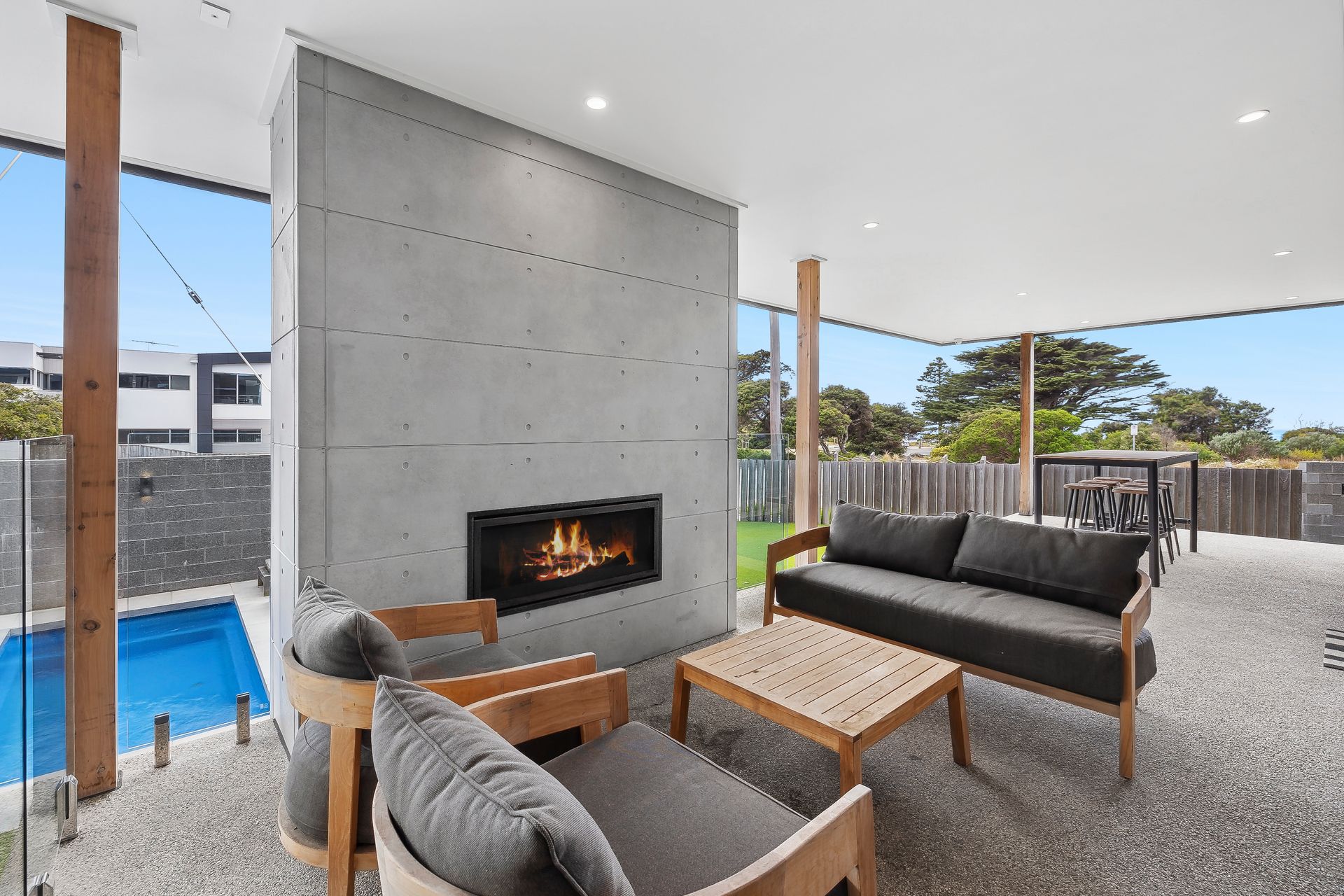 Downstairs the stunning pool is surrounded by separate entertaining spaces that offer plenty of seating. The lounge area, with its outdoor gas fire, is perfect for cooler evenings or casual socializing. There’s also a large lawn area for kids to play, plus an outdoor basketball ring to keep everyone entertained. After a day at the beach, rinse off in the outdoor shower. Inside, the downstairs lounge provides another relaxed space to hang out, with a TV and bar fridge for added convenience. There’s also a bar table outside for casual dining or enjoying drinks together.