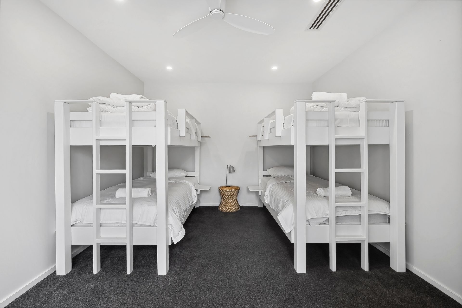 The downstairs level also features two queen rooms with ensuites, each providing guests with their own private space and bathroom. The king room with ensuite, walk-in robe, and TV offers a luxurious retreat, perfect for those seeking extra space and privacy. A second king room is equally spacious, while the bunk room is perfect for kids or additional guests, sleeping up to 4 people in comfort. A family bathroom is also available.