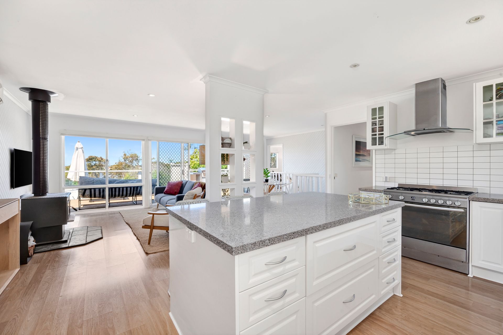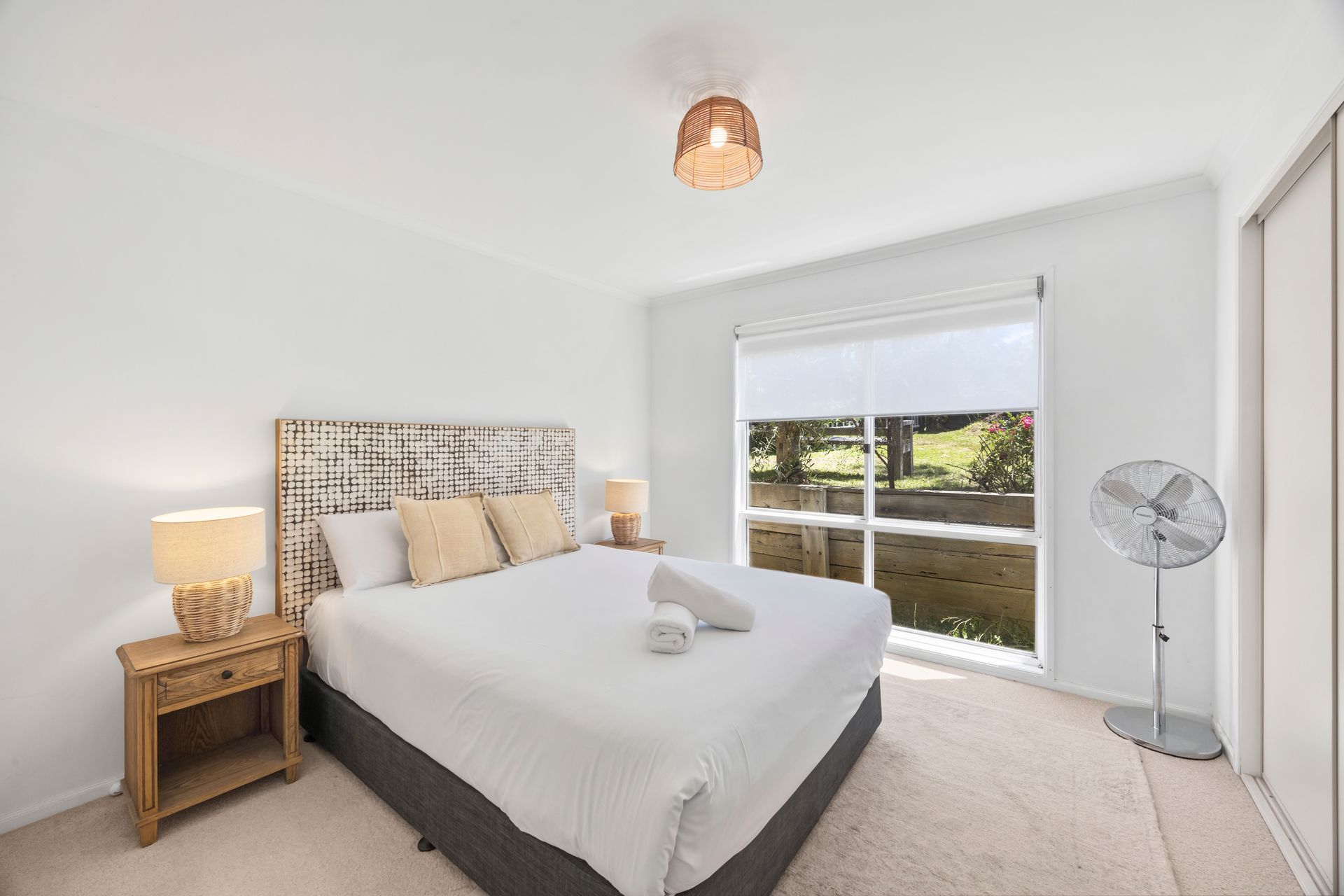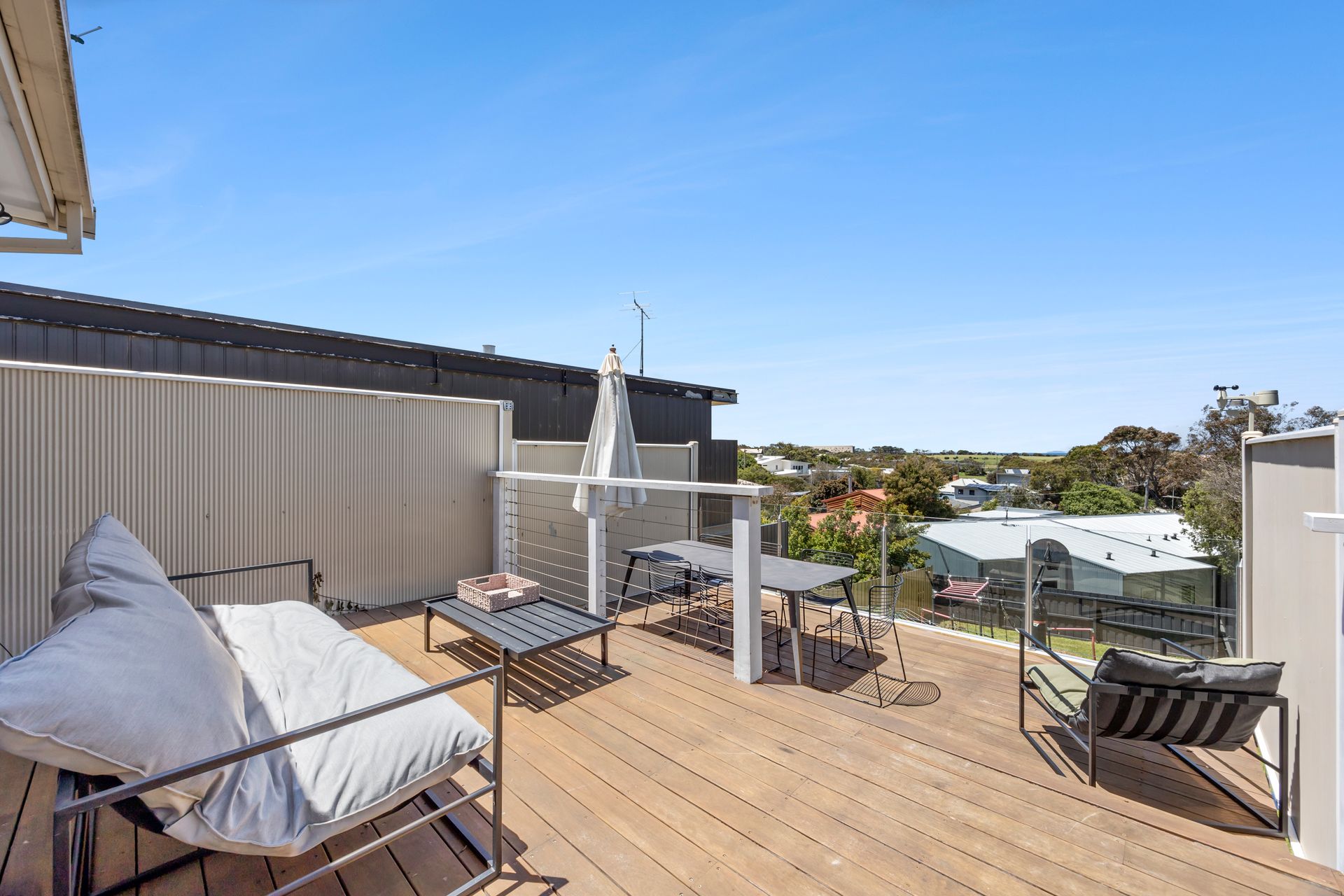 The upper level boasts two spacious living areas, both equipped with Smart TVs, and a fantastic entertainer’s kitchen complete with an espresso machine. This area also features air conditioning for year-round comfort. Flowing from the living spaces is a large deck offering breathtaking views over the RACV golf course and out to the ocean. The deck is furnished with a dining table, outdoor lounge seating, and a new BBQ—perfect for alfresco dining and relaxing in the coastal breeze.