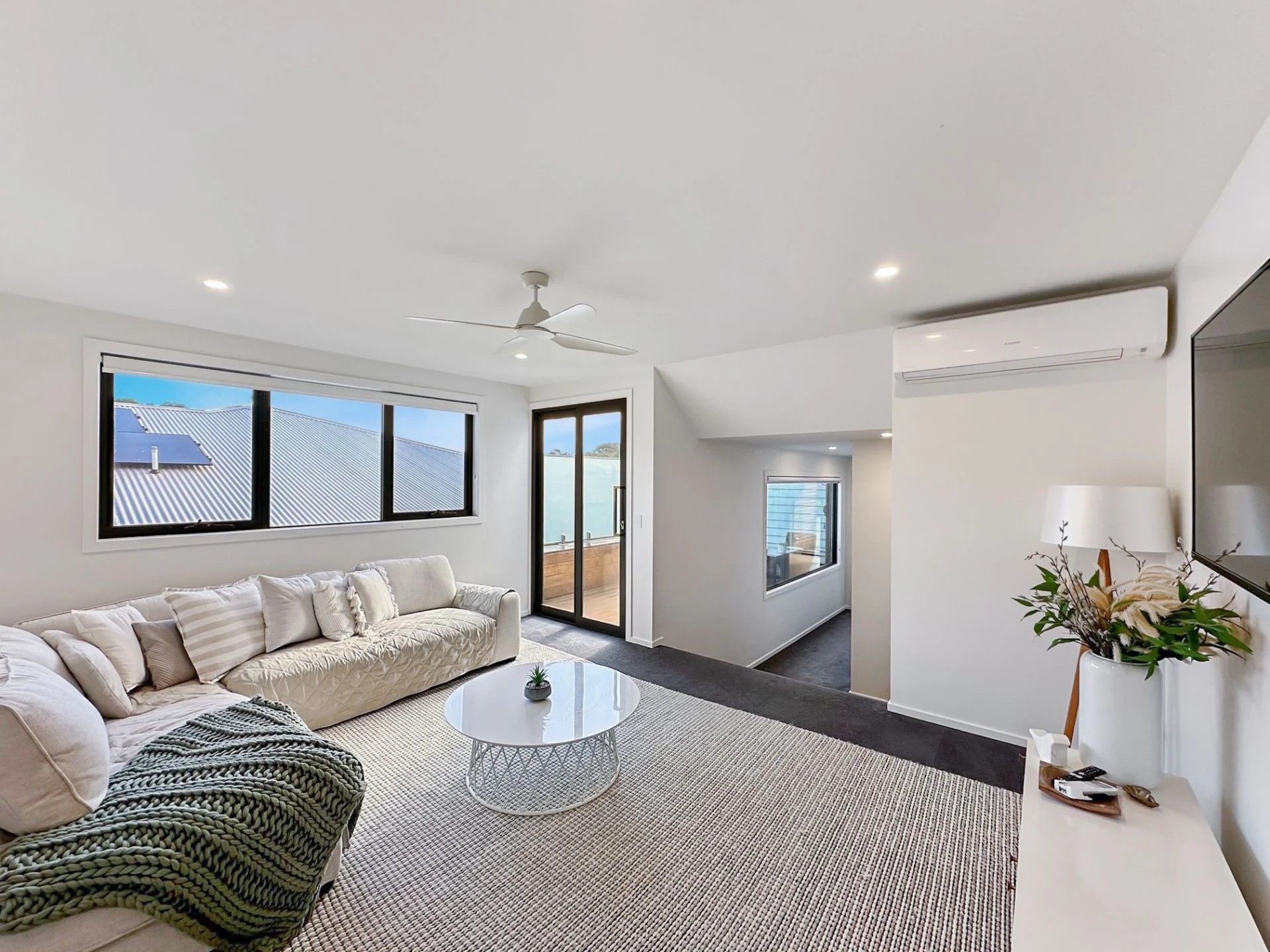 Upstairs, the master suite features a king bed, private ensuite, and its own deck overlooking the treetops. Two additional queen bedrooms provide comfortable accommodation, while a second living room with a TV offers a quiet retreat for reading or relaxing. The family bathroom includes a bathtub, ideal for unwinding after a day at the beach.